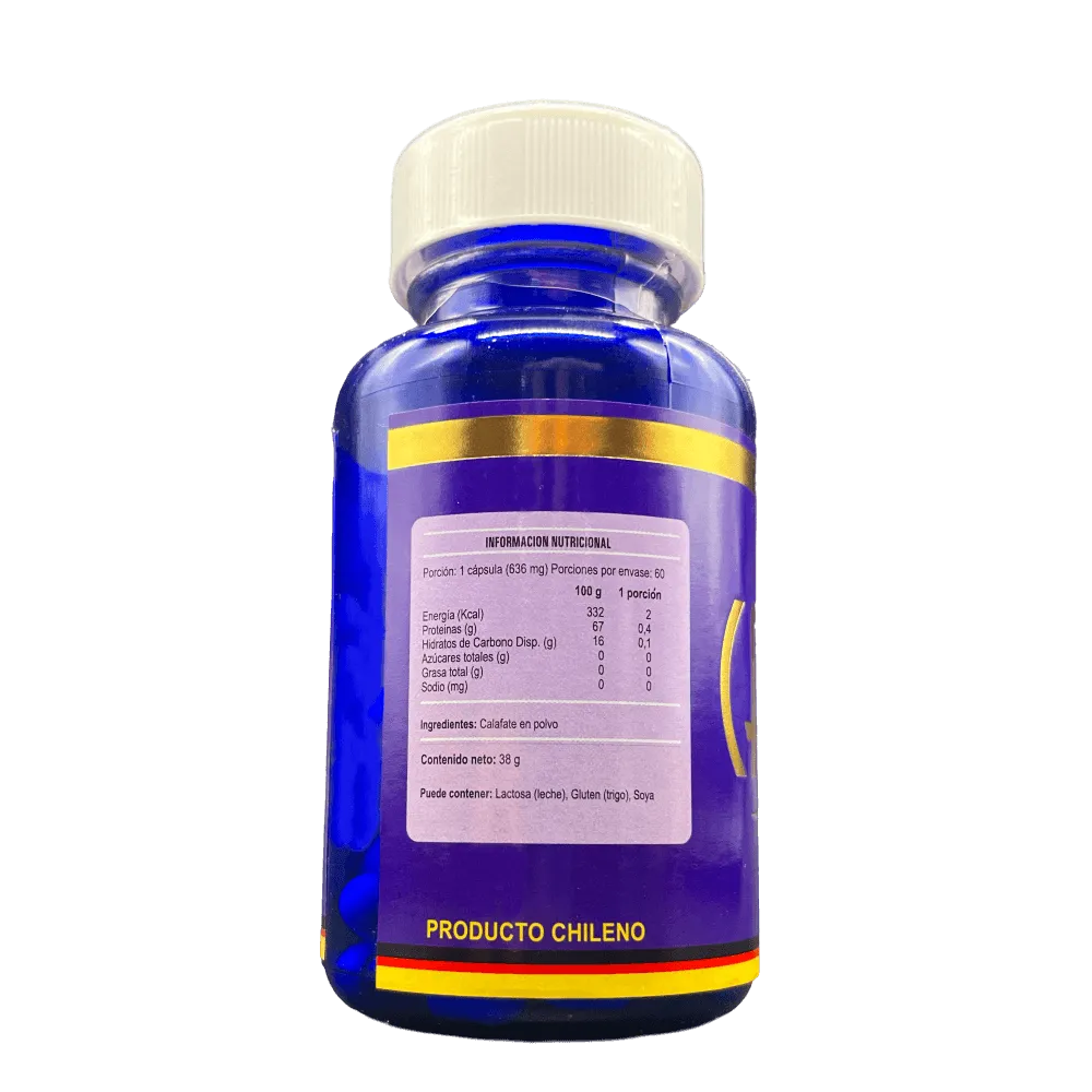 Cada cápsula contiene 500 mg de Calafate puro, capturando la esencia íntegra de esta baya patagónica en su forma más potente y biodisponible.