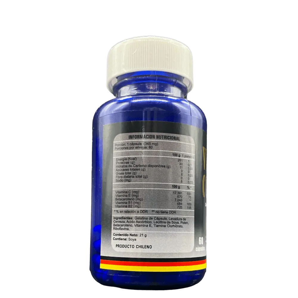Cada cápsula de VITAL COMPLEX es como un amanecer para tu cuerpo y mente. La Levadura de Cerveza y el Polen nutren cada célula, mientras que las Vitaminas C y E, junto con el Betacaroteno, forman un escudo protector contra el estrés oxidativo. Es tu aliado perfecto para mantener un rendimiento óptimo en todas las áreas de tu vida, desde el trabajo hasta tus momentos más íntimos.